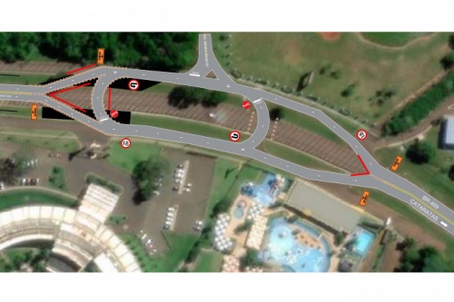 Entre o km 2+400 e o km 2+700 o retorno em frente ao hotel Vivaz Cataratas será realizado apenas pelas vias marginais, visando garantir a segurança de usuários e funcionários durante a execução do viaduto e de seus muros de contenção.