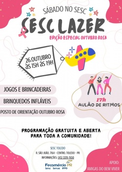 Neste sábado, 26 de outubro, o Serviço Social do Comércio (Sesc) de Toledo realiza uma edição especial do Sesc Lazer em apoio à campanha Outubro Rosa. O evento será realizado das 15h00 às 19h00, na Rua São João, Nº 7.164, no Centro de Toledo, com uma programação gratuita e aberta a toda a comunidade.