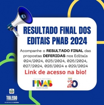 No último sábado, dia 16 de dezembro, a Secretaria de Cultura de Toledo divulgou o resultado final das propostas inscritas nos editais 024/2024, 025/2024, 026/2024, 027/2024, 028/2024 e 029/2024, fomentados com recursos da Política Nacional Aldir Blanc de Incentivo à Cultura (PNAB). A iniciativa tem como objetivo fortalecer e fomentar projetos culturais e artísticos na cidade, beneficiando artistas, produtores culturais, mestres e mestras de arte e cultura.