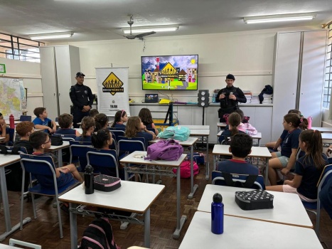 A equipe EducaTrânsito da Guarda Municipal (GM) de Toledo iniciou, nesta quinta-feira (27), o programa de educação no trânsito de 2025 na Escola Municipal Arsênio Heiss, no Jardim Porto Alegre. Foram três guardas municipais que fizeram uma apresentação sobre bom comportamento no trânsito e atividades para 25 estudantes do 4º ano fundamental, que incluiu perguntas, mostra de equipamentos de simulação de trânsito, vídeo, brindes, entre outros. A equipe é integrada pelos GMs: Fonseca, Evandro e Mendes.