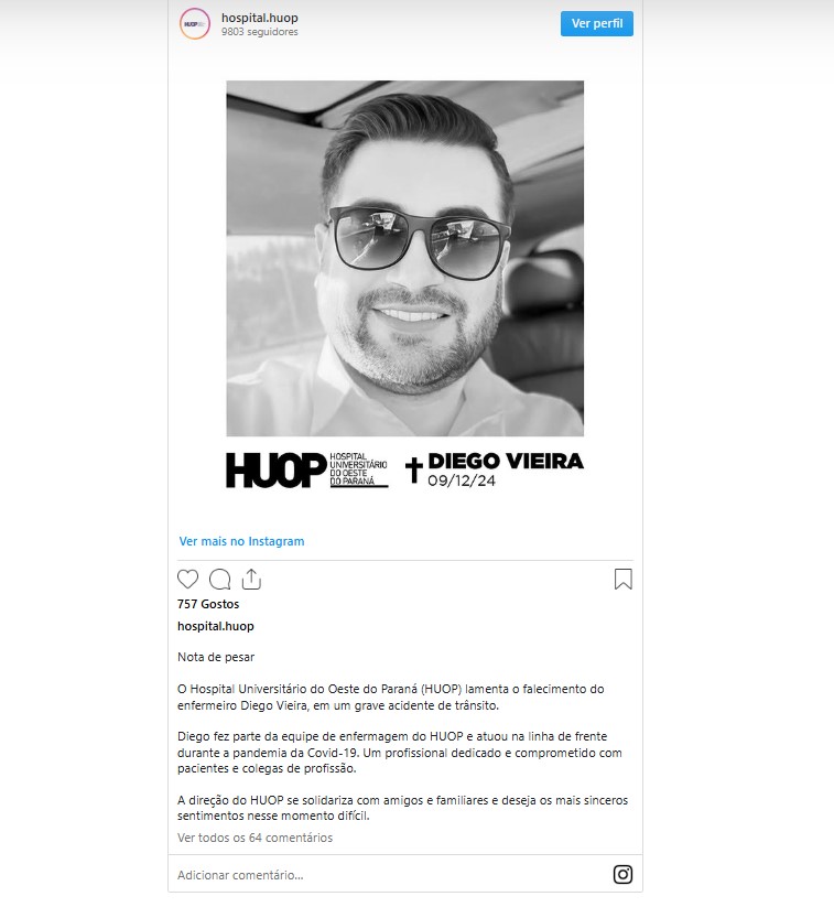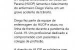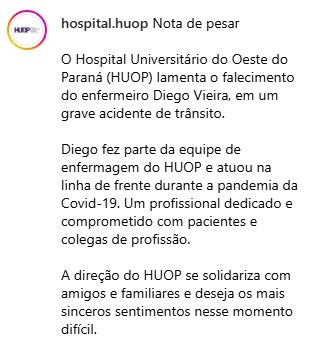 Além de seu trabalho no Hospital Regional, Diego também integrou a equipe do Hospital Universitário do Oeste do Paraná (Huop), em Cascavel, onde atuou na linha de frente durante a pandemia de Covid-19. O Huop emitiu nota de pesar destacando a sua dedicação profissional e lamentando a sua morte.