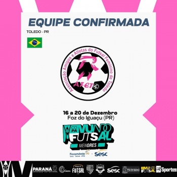 As equipes Sub-11 e Sub-13 da Associação dos Amigos e Atletas do Futsal e Futebol Feminino de Toledo (Afeto) estão confirmadas na disputa da Copa Mundo do Futsal Sesc – Menores, que está sendo realizada em Foz do Iguaçu-PR, entre os dias 16 e 20 de dezembro. O torneio integra a programação do Mundo do Futsal Experience, o maior evento mundial voltado para profissionais e fãs da modalidade.