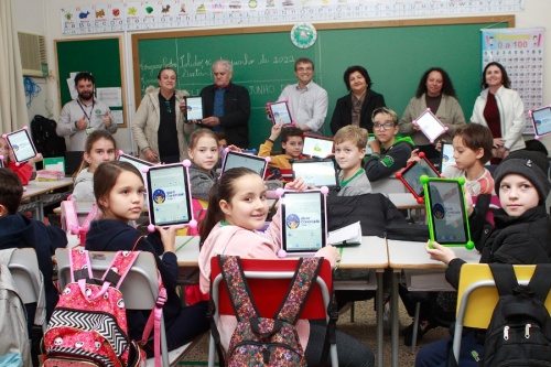 Estudantes do 5º ano do período vespertino da Escola Amélio Dal Bosco (Jardim La Salle) foram os primeiros contemplados com os tablets do “Aluno Conectado”, programa que tem o objetivo de colocar a tecnologia a serviço do aprendizado dos alunos da rede municipal de ensino de Toledo, tornando a aprendizagem de conteúdos letivos mais inovadora e atraente para as crianças. A entrega de 31 unidades do dispositivo ocorreu na tarde desta sexta-feira (10) em ato que contou com a presença do prefeito Beto Lunitti; da secretária da Educação, Marli Gonçalves Costa; e dos vereadores Leoclides Bisognin (presidente do Legislativo) e Olinda Fiorentin.