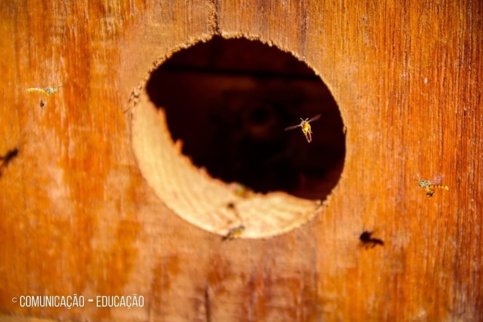 O Jardim de Água e Mel conta com decks, bancos, flores, plantas alimentícias não convencionais (PANCs) e colmeias de abelhas sem ferrão, criando um ambiente educativo que ensina sobre a importância das abelhas para a biodiversidade e o equilíbrio ambiental.