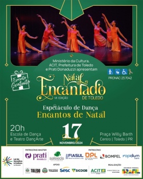 Para abrir a programação de apresentações culturais, o Natal Encantado de Toledo – VII edição traz neste domingo, dia 17 de novembro às 20h00, o Espetáculo de dança Encantos de Natal, da Escola de dança e teatro DançArte.