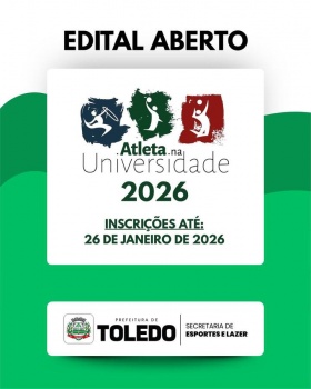 A Prefeitura de Toledo, por meio da Secretaria de Esportes e Lazer (Smel), abriu as inscrições para o programa “Atleta na Universidade”, processo seletivo destinado a atletas que cursam ensino superior para a concessão de bolsas-auxílio. As inscrições vão até o dia 26 de janeiro de 2026 e são especificamente para os atletas que representam o município de Toledo em competições oficiais. O edital de abertura pode ser acessado no link.