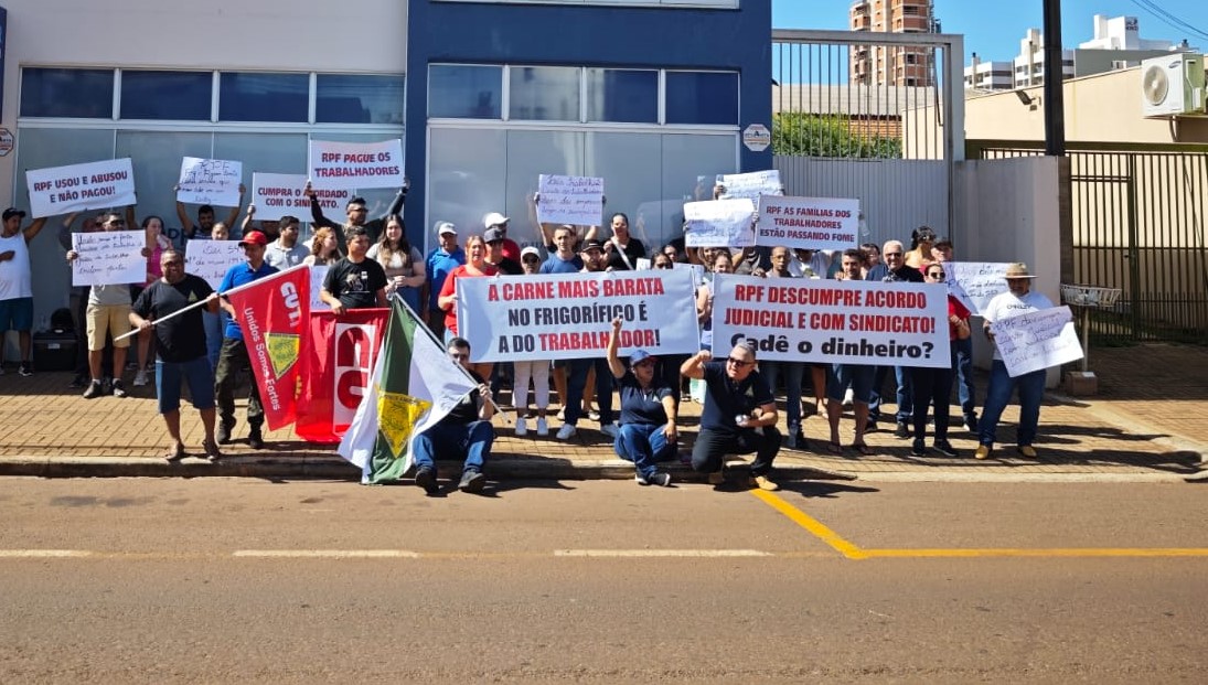 Cerca de 50 trabalhadores demitidos do Frigorífico Rainha da Paz realizaram, na manhã desta sexta-feira (16), uma manifestação em frente à sede administrativa da empresa, localizada na Avenida Parigot de Souza, na região central de Toledo. O ato reuniu ex-funcionários e membros do Sindicato dos Trabalhadores nas Indústrias da Alimentação de Toledo, que levaram cartazes, entoaram palavras de ordem e cobraram o pagamento de direitos trabalhistas que, segundo eles, seguem em atraso.