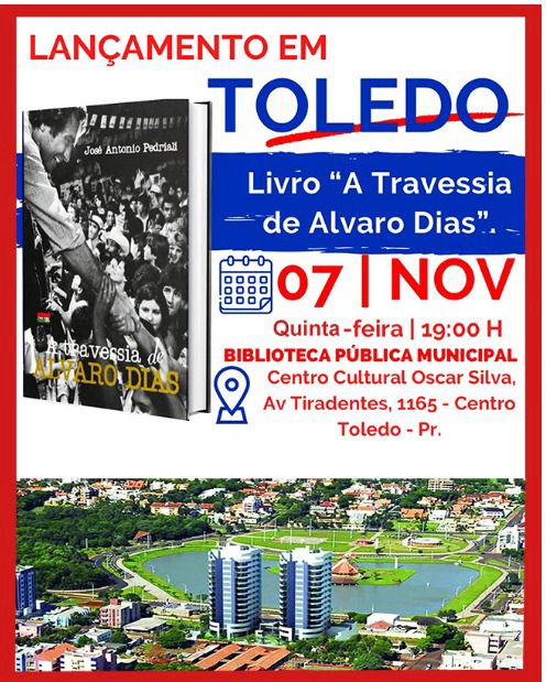 O ex-senador Álvaro Dias (Podemos) estará em Toledo, nesta quinta-feira (07), para o lançamento do livro A Travessia de Álvaro Dias, escrito pelo jornalista José Pedrali. A obra detalha a trajetória política e pessoal de Dias ao longo de seus 50 anos de vida pública, incluindo passagens como vereador, deputado federal, senador por quatro mandatos e governador do Paraná entre 1987 e 1991.