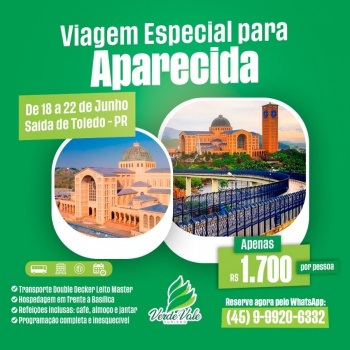 Entre os dias 18 e 22 de junho, será realizada uma viagem especial para Aparecida do Norte-SP, com saída diretamente de Toledo. Uma oportunidade única para viver momentos de fé, espiritualidade e conhecer de perto a história do segundo maior santuário católico do mundo.
