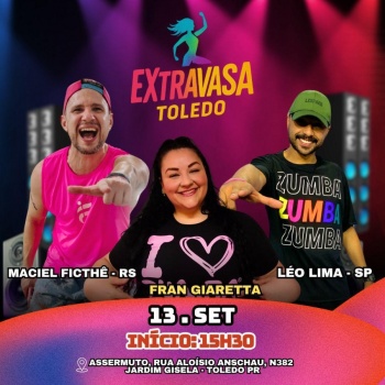 Toledo vai receber, no dia 13 de setembro, o Extravasa Toledo, evento de dança que promete movimentar a cidade com workshops e uma masterclass aberta ao público. A atividade será realizada na Associação dos Servidores Municipais de Toledo (Assermuto), na Rua Aloísio Anschau, Nº 382, no Jardim Gisela, a partir das 15h30.