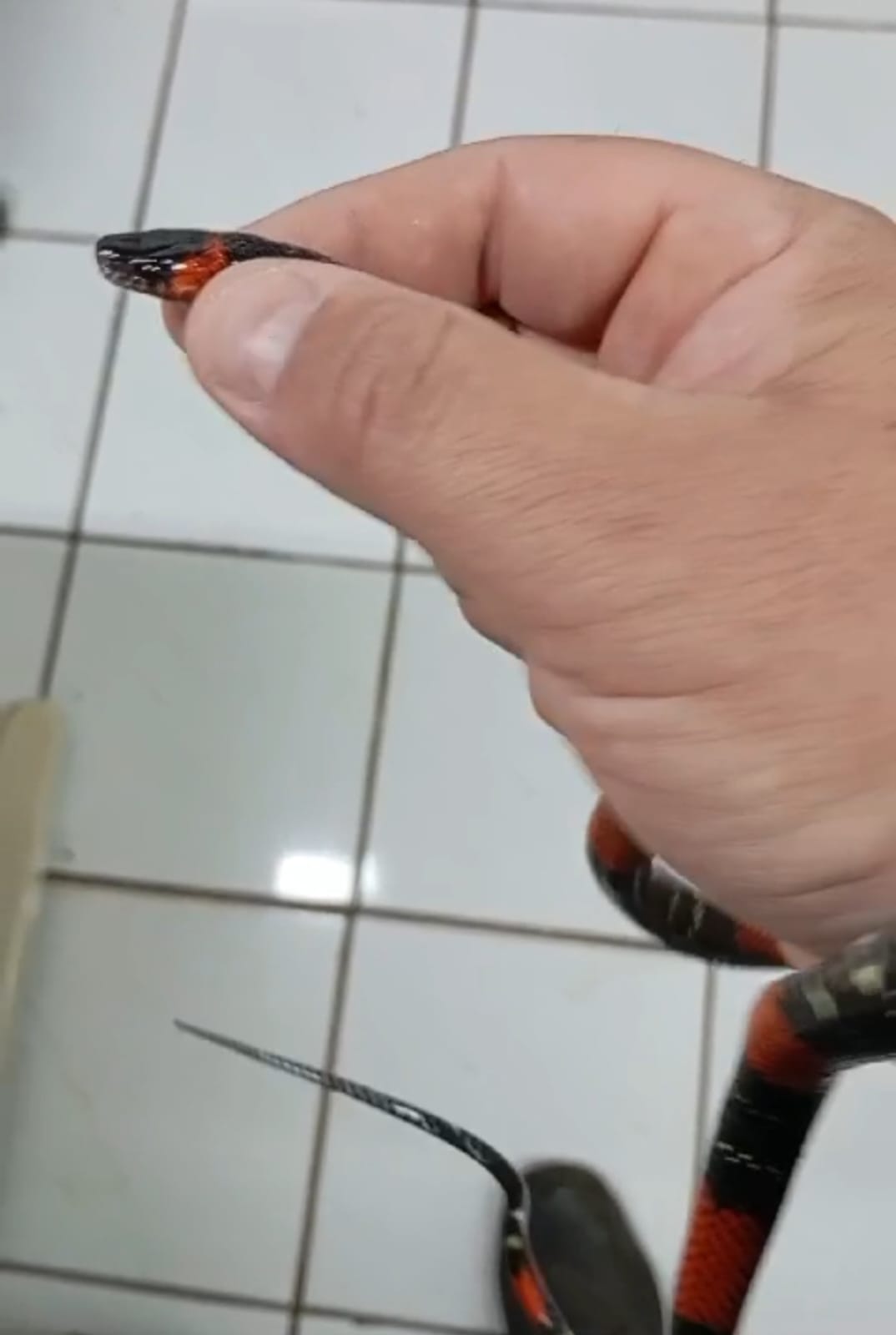 Apesar da coloração semelhante à coral verdadeira, a serpente resgatada foi identificada como uma Oxyrhopus Guibei, conhecida como falsa coral. Essa espécie é inofensiva, mas, devido à sua aparência, é frequentemente confundida com as corais verdadeiras, que possuem um veneno altamente perigoso. Tiago destacou a dificuldade de distinguir essas espécies pela coloração, já que existem mais de 30 padrões de coral verdadeira e mais de 60 de falsa coral. “A identificação precisa é feita pela dentição e pelo formato dos olhos, mas isso deve ser realizado por profissionais qualificados para evitar acidentes”, alertou.