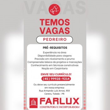 Farlux Construtora e Incorporadora de Toledo abre vagas para Pedreiro! Confira os requisitos e candidate-se aqui