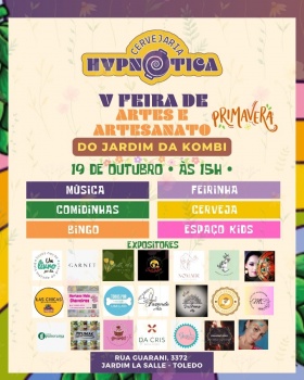 A 5ª Edição da Feira de Artes e Artesanato do Jardim da Kombi será realizada no próximo sábado, 19 de outubro, em Toledo, a partir das 15h00. O evento, realizado ao ar livre no Jardim da Cervejaria Hypnótica, é gratuito e busca fortalecer a economia criativa da região. Artesãos, artistas e empreendedores criativos de Toledo e arredores irão expor os seus trabalhos, que incluem desde brechós e sebos de livros e discos até artesanatos variados como crochê e mandalas. Também haverá produtos da Embaixada Solidária Toledo disponíveis para compra.