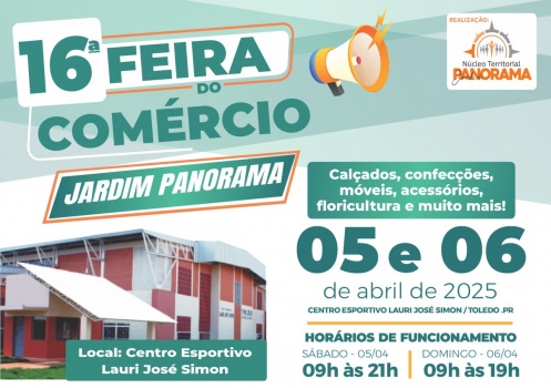 Nos dias 5 e 6 de abril, o Núcleo Territorial do Jardim Panorama, vinculado à Associação Comercial e Empresarial de Toledo (ACIT), realiza a 16° Feira do Comércio. A feira, que acontece no Ginásio de Esportes Lauri José Simon, no Jardim Panorama, estará aberta no sábado (5), das 9h às 21h e no domingo (6), das 9h às 19h.