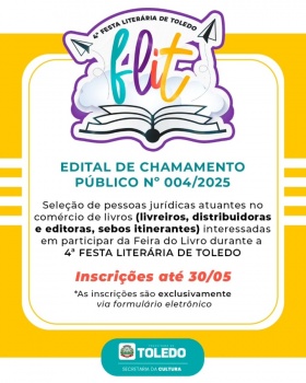 A Prefeitura de Toledo abriu o período de inscrições para o credenciamento de empresas interessadas em participar da Feira do Livro durante a 4ª Festa Literária de Toledo (FLIT), que será realizada entre os dias 23 e 29 de junho.