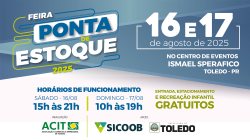 Aguardada pelos consumidores, a 25ª edição Ponta de Estoque da Associação Comercial e Empresarial de Toledo (ACIT) inicia neste sábado (16) e com a expectativa de receber aproximadamente 20 mil pessoas até domingo (17). O evento começa às 15h00 do sábado, no Centro de Eventos Ismael Sperafico.