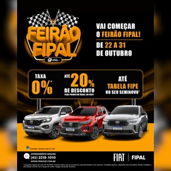 A Fiat Fipal de Toledo convida todos para o Feirão Fipal neste sábado, dia 25 de outubro, a partir das 08h30, na concessionária de Toledo. Um dia especial com condições exclusivas para quem quer sair de carro novo.