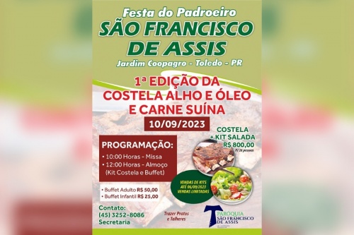 A comunidade do Jardim Coopagro, em Toledo, está se preparando para uma celebração memorável em honra ao seu padroeiro, São Francisco de Assis. Pela primeira vez, a festa contará com uma atração gastronômica especial: a deliciosa Costela Alho e Óleo e Carne Suína. A festa está marcada para o dia 10 de setembro de 2023 e promete ser um evento imperdível para todas as idades.