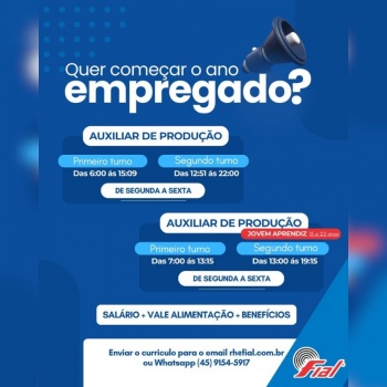 A Fial Indústria e Comércio de Fios Têxteis, localizada em Toledo, está com oportunidades abertas para quem busca ingressar ou se desenvolver no setor industrial, oferecendo vagas para Auxiliar de Produção e também na modalidade Jovem Aprendiz.