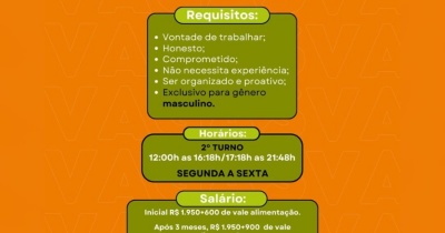 Para a função de Auxiliar de Produção, há opções de primeiro turno, das 6h00 às 15h09, e segundo turno, das 12h51 às 22h00, com regime de trabalho de segunda a sexta-feira. Já para Auxiliar de Produção na modalidade Jovem Aprendiz, destinada a candidatos de 15 a 22 anos, os horários disponíveis são no primeiro turno, das 07h00 às 13h15, e no segundo turno, das 13h00 às 19h15, também de segunda a sexta-feira.