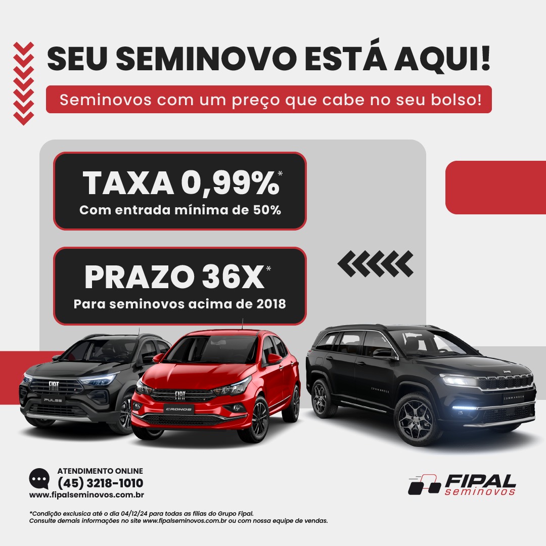 A Fipal Fiat de Toledo traz condições exclusivas até sábado, 30 de novembro. É a oportunidade ideal para garantir o seu carro novo ou seminovo com vantagens incríveis.