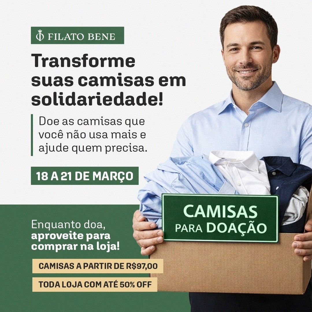 A Filato Bene realiza, entre os dias 18 e 21 de março, a ação solidária “Doe ou Rasgue”, em Toledo, com o objetivo de incentivar a doação de roupas e ajudar pessoas em situação de vulnerabilidade. A meta principal da campanha é arrecadar 2.000 camisas, que serão destinadas a ONGs, instituições de caridade e igrejas.