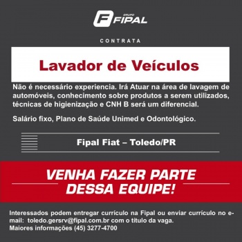 A Fipal de Toledo oferece uma excelente oportunidade na área de lavação automotiva para quem deseja integrar uma das maiores concessionárias da região. O cargo será para atuar na lavagem de automóveis.