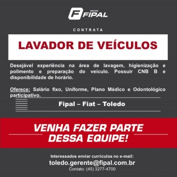 Fipal Fiat de Toledo abre vaga para Lavador de Veículos! Envie o seu currículo aqui!