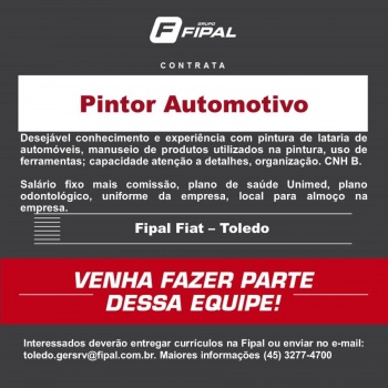 Fipal Fiat de Toledo abre vaga para Pintor Automotivo! Envie o seu currículo aqui