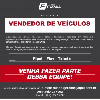 Fipal Fiat de Toledo contrata Vendedor de Veículos; confira os detalhes e envie o seu currículo aqui