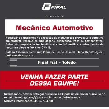 A Fipal Fiat de Toledo está com vaga aberta para Mecânico Automotivo. A empresa busca profissionais com experiência em manutenção preventiva e corretiva de motores, reparo de embreagens, suspensão, freios, troca de componentes e demais serviços relacionados. É necessário ter habilidade com informática, conhecimento em mecânica diesel e flex, além de Carteira Nacional de Habilitação (CNH) Categoria B.