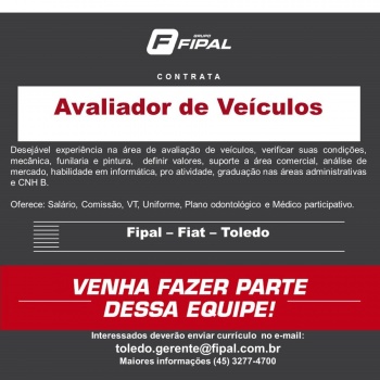 A Fipal Fiat de Toledo está contratando Avaliador de Veículos para integrar a sua equipe. A vaga é destinada a profissionais com experiência na área de avaliação de veículos, responsáveis por verificar condições mecânicas, funilaria e pintura, definir valores e oferecer suporte à área comercial. Também é desejável conhecimento em análise de mercado, habilidade em informática, proatividade, graduação nas áreas administrativas e Carteira Nacional de Habilitação (CNH) Categoria B.