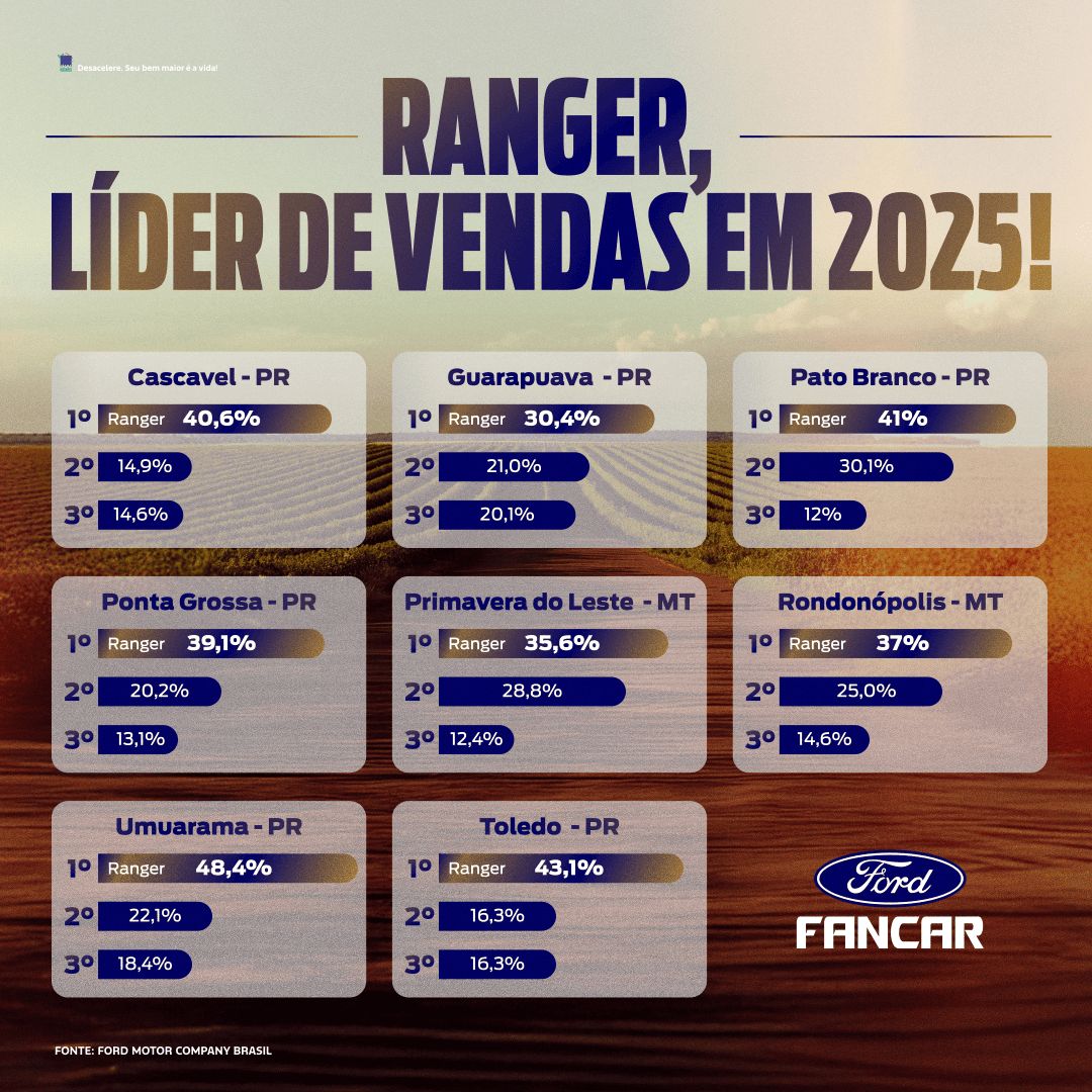 Com nove lojas espalhadas entre o Paraná (Cascavel, Foz do Iguaçu, Guarapuava, Pato Branco, Ponta Grossa, Toledo e Umuarama) e Mato Grosso (Rondonópolis e Primavera do Leste), a Ford Fancar também foi líder de vendas da Ranger, a melhor picape do mercado, em 2025, em aproximadamente todas as praças que atua.