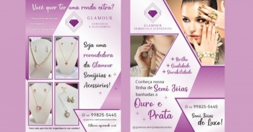 A Glamour Semijóias e Acessórios oferece uma chance para quem deseja aumentar a sua renda de forma simples e acessível. Com uma galvânica que proporciona o banho de peças em ouro, prata e ródio, a empresa se destaca pela qualidade, garantia e sofisticação de seus produtos.