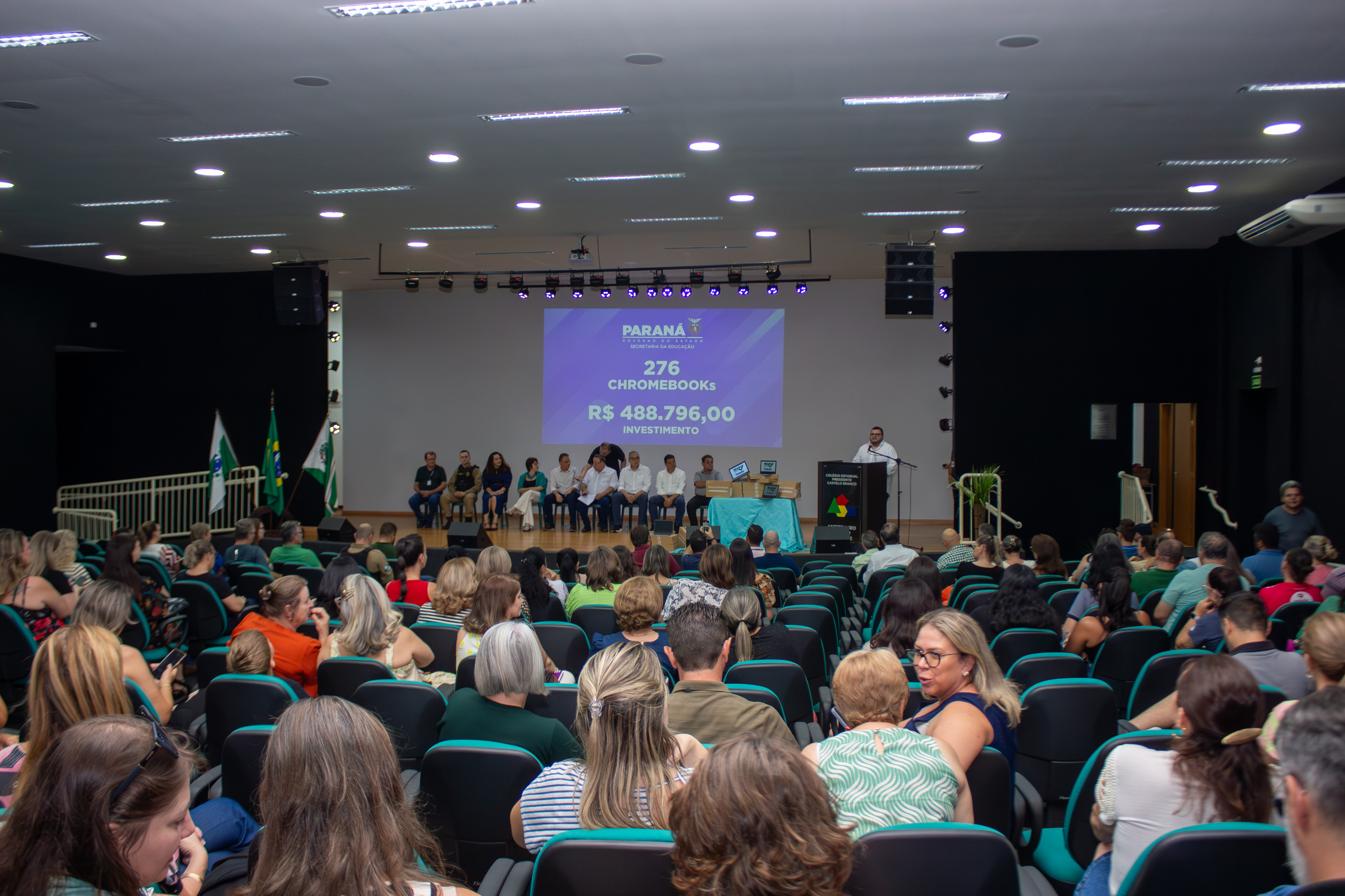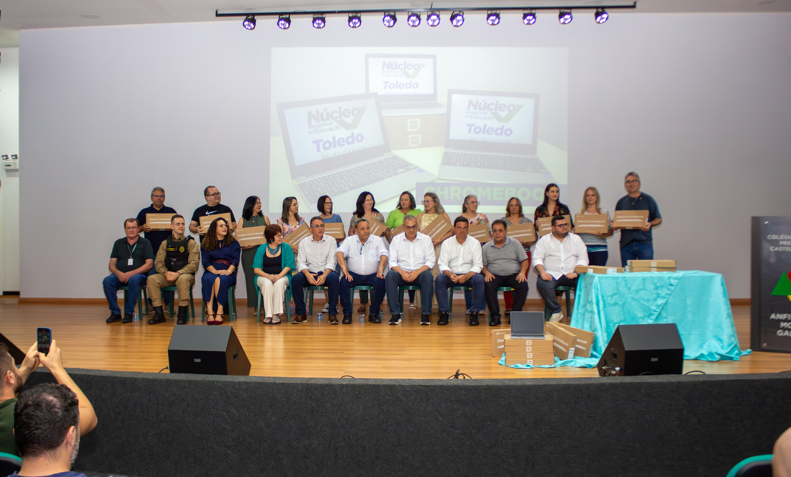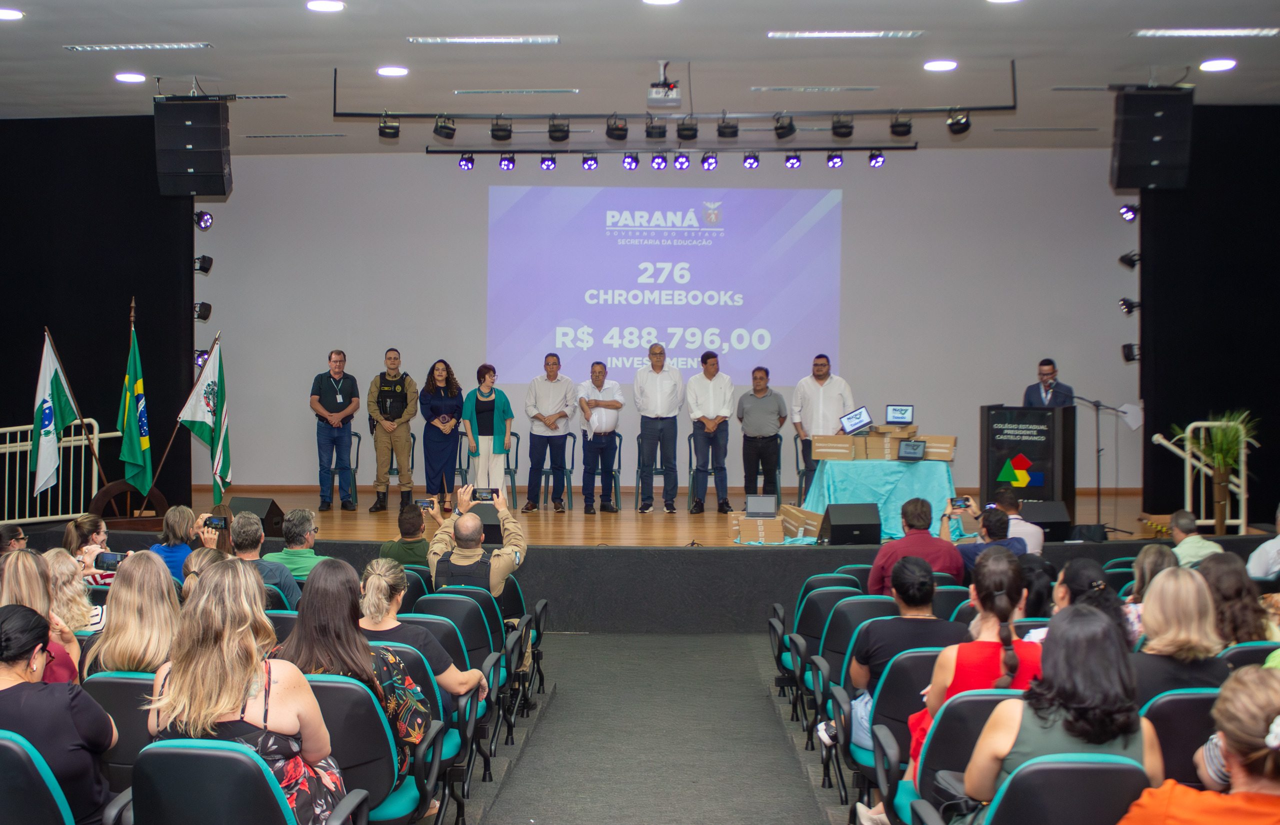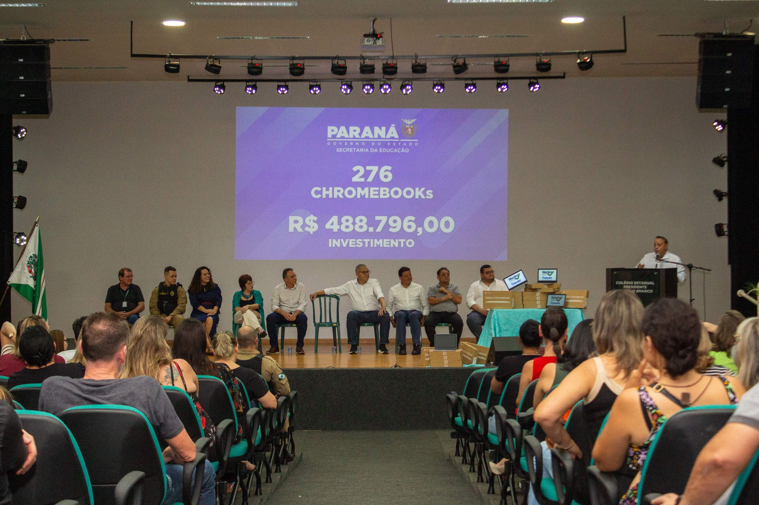 A cerimônia de entrega foi realizada na quarta-feira, 19, no Anfiteatro Moacir Galante, no Colégio Estadual Presidente Castelo Branco (Premen), e contou com a presença de deputados estaduais, prefeitos, vereadores, diretores, professores, equipe do NRE Toledo e representantes da imprensa. Os colégios beneficiadas incluem unidades de Toledo, Guaíra, Marechal Cândido Rondon, Palotina, Santa Helena, Terra Roxa e Quatro Pontes, reforçando o compromisso do Governo Estadual com a inclusão digital e a inovação no ensino público.