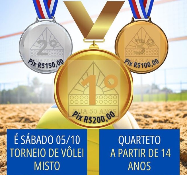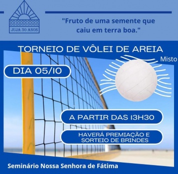 No próximo sábado, dia 05 de outubro, será realizado um torneio de vôlei de areia a partir das 13h30, no Seminário Nossa Senhora de Fátima. O evento é aberto para jovens a partir de 14 anos, e as inscrições podem ser feitas gratuitamente pelo Instagram do grupo.