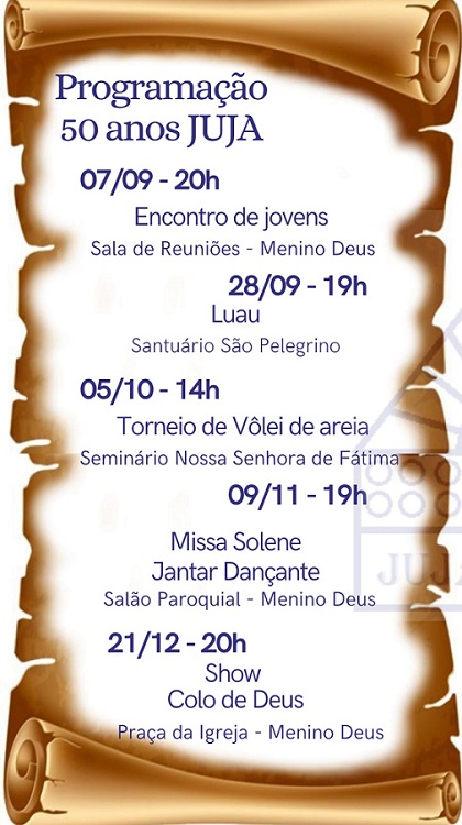 O jantar dançante faz parte das celebrações do jubileu de ouro do grupo, fundado em 1974 com o apoio do saudoso Frei Euzébio. Ao longo de cinco décadas, o Juja se tornou um importante espaço de formação e integração para a juventude católica da comunidade do Jardim Porto Alegre. Entre as diversas atividades promovidas pelo grupo, destacam-se a tradicional encenação da Paixão de Cristo na Páscoa, homenagens em datas comemorativas como o Dia das Mães, e campanhas solidárias de arrecadação de brinquedos e alimentos.
