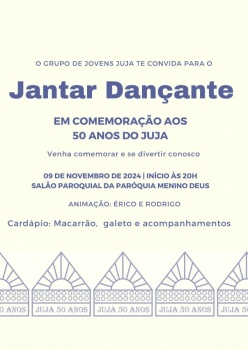 O Grupo de Jovens Juja, da Paróquia Menino Deus, do Jardim Porto Alegre, em Toledo, segue com as comemorações de seus 50 anos de fundação. No próximo dia 09 de novembro, o grupo realizará uma missa solene às 19h00, seguida de um jantar dançante no Salão Paroquial, com início às 20h00. O evento terá como atração musical a dupla Érico e Rodrigo, e o cardápio contará com macarrão, galeto e acompanhamentos. O valor do convite é de R$ 50,00, e toda a renda será destinada para custear o show da banda Colo de Deus, marcado para o dia 21 de dezembro.