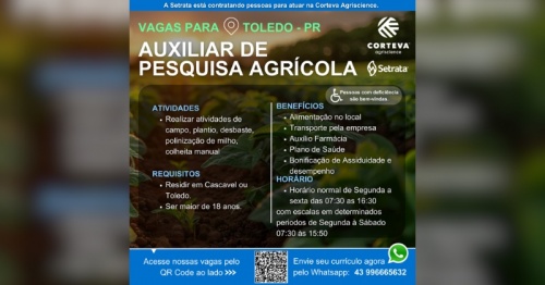 O Grupo Setrata está com vaga aberta para Auxiliar de Pesquisa Agrícola. O selecionado irá auxiliar em diversas atividades relacionadas ao campo, como plantio, desbaste, polinização de milho e colheita manual.