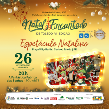 O Natal Encantado de Toledo é realizado através da Lei Federal de incentivo à Cultura. Apoio: Governo Municipal de Toledo, Câmara Municipal de Toledo, Sesc. Patrocinio: Prati Donaduzzi, DPL, Safeeds e Sicoob Meridional. Realização: ACIT, Ministério da Cultura, Governo Federal Brasil | União e Reconstrução.