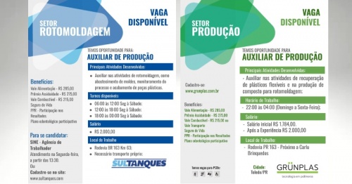 Vaga 02 - Grünplas / Setor: Produção / Cargo: Auxiliar de Produção