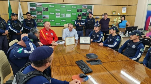 Agentes da guarda municipal estiveram presentes, na manhã desta terça-feira (29), na Sala de Reuniões do Gabinete do Prefeito, para prestigiar a entrega do Certificado de Bravura para a guarda municipal Elaine Maria Klein, que salvou, na última quinta-feira (24), a vida de uma criança com 16 dias de vida de um engasgo com leite materno. Honraria semelhante também foi oferecida a toda a corporação, representada pelo agente Paulo Junior Cesario Vaz, que ficou responsável por levá-la à Secretaria de Segurança e Mobilidade Urbana (SMSMU).