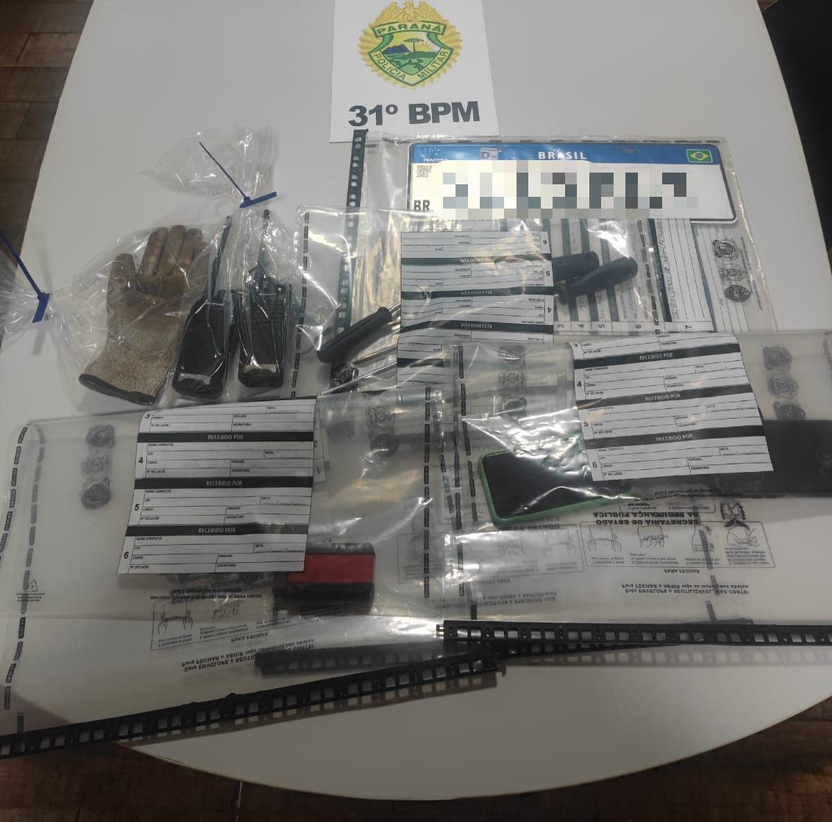 Os outros dois ocupantes foram detidos ainda no local. Com eles, foram apreendidos diversos objetos suspeitos de ligação com atividades criminosas, como placas veiculares possivelmente clonadas, ferramentas, luvas, rádios comunicadores, celulares e um aparelho OBD (utilizado para acesso ao sistema eletrônico de veículos). Ambos receberam voz de prisão, com leitura dos direitos constitucionais, e foram algemados por medida de segurança.