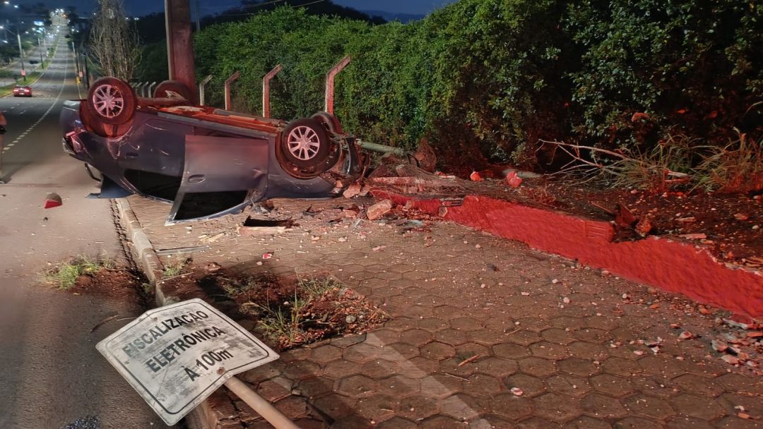 Um capotamento mobilizou equipes de emergência no início da manhã deste sábado (31) na cidade de Toledo (PR), após um veículo invadir a calçada e atingir estruturas à margem da via.