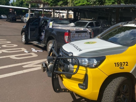 Durante as diligências, os policiais aboradaram o suspeito, de 35 anos, que conduzia uma caminhonete Ford Ranger carregada com aproximadamente 1.500 pacotes de cigarros contrabandeados.