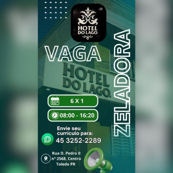 O Hotel do Lago, em Toledo, está com vaga aberta para zeladora. A oportunidade oferece salário de R$ 2.000,00, vale-alimentação de R$ 380,00 e vale-transporte.