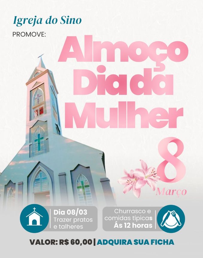 A tradicional Igreja do Sino, em Toledo, promove no domingo, dia 08 de março, o já conhecido Almoço do Dia da Mulher, evento que reúne fé, confraternização e boa gastronomia em um momento especial para celebrar a data. A programação será realizada no Salão de Festas da Igreja do Sino, localizado na Rua Bento Munhoz da Rocha Neto, Nº 1.686, no Centro da cidade.