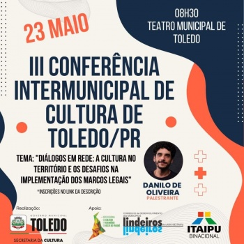 No próxima terça-feira (23), a partir das 08h00, terá início a III Conferência Intermunicipal da Cultura de Toledo, que será realizada no Teatro Municipal. O evento promete reunir representantes de 28 municípios da região, que fazem parte da Rede Regional de Cultura e Patrimônio do Oeste do Paraná.