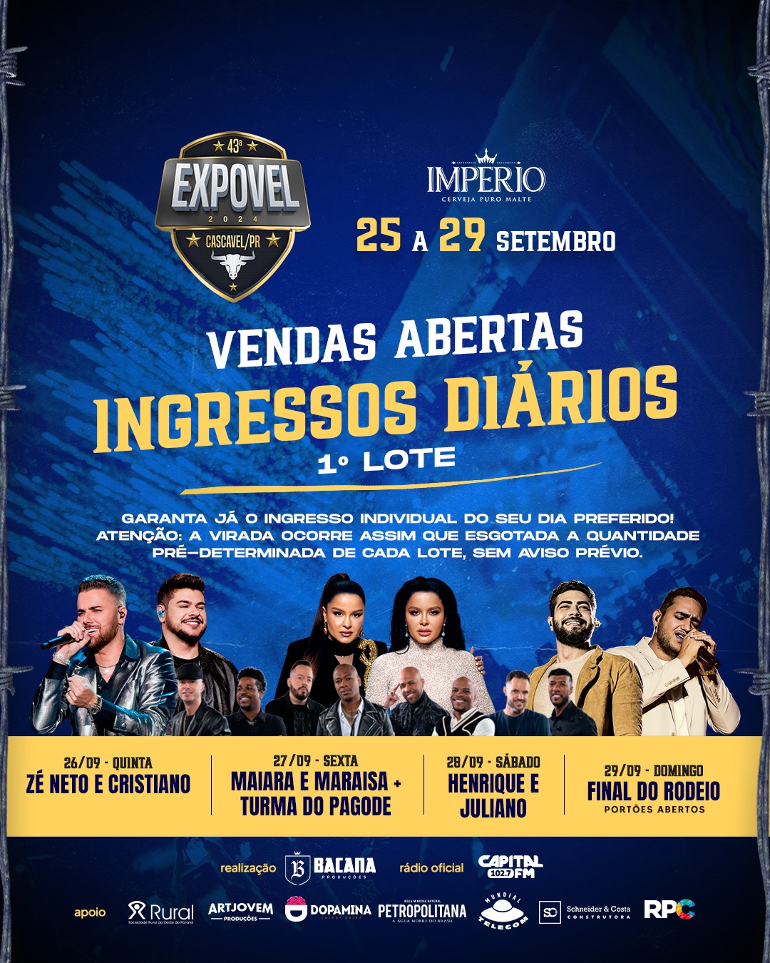A 43ª edição da ExpoVel ocorrerá de 25 a 29 de setembro na Sociedade Rural de Cascavel (Expovel). Prepare-se para uma experiência inesquecível com shows de Zé Neto & Cristiano, Maiara & Maraisa, Turma do Pagode e Henrique & Juliano.