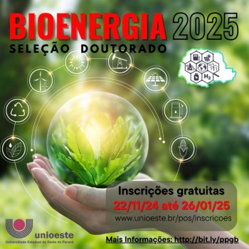 O Programa de Pós-Graduação em Bioenergia (PPGB) da Universidade Estadual do Oeste do Paraná – Unioeste - campus de Toledo abriu vagas para Mestrado e Doutorado para o ano letivo de 2025. São sete vagas para cada curso, sendo seis para ampla concorrência e uma para pessoa com deficiência (PCD). O PPGB tem cinco docentes permanentes que atuarão como orientadores, tanto das dissertações de mestrado quanto das teses de doutorado, e seguem duas linhas de pesquisa: Biocombustíveis, e Energias Renováveis.